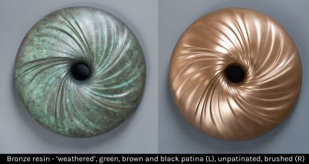 When the copper in bronze oxidises in a natural environment a Verdigris patina will form but the use of different chemicals on the surface will create other colours. However some chemicals will react with the metal only when a certain temperature has been achieved. With foundry bronze a blow torch can be used without melting the metal but bronze resin can’t be heated as much. As a result there is a wider selection of patina colours available when working with foundry bronze. As there are various metals used in creating the alloy, such as tin, nickel, iron, lead and aluminium, the grade of bronze used will also influence the colour. As bronze resin is a composite material made of resin and bronze powder then the percentage of metal is far lower than in foundry bronze. In addition, bronze powder is heavier than resin so it will sink and therefore to some degree, the geometry of the form itself may also affect the amount of bronze exposed at the surface. These two factors will therefore affect the intensity and regularity of the patina formed on bronze resin.