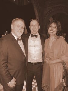 We were shown through to the Hintze Hall, with the giant whale skeleton suspended above us,  lit up in blue of course, and we were treated to champagne and the finest hors d’oeuvres from start to finish. Midway through the party we turned to face a drumming troupe perform a Samba routine and lo and behold there was Bill Bailey again, right in front of us this time, disguising his willingness to be near me again by strutting his stuff to the beats.