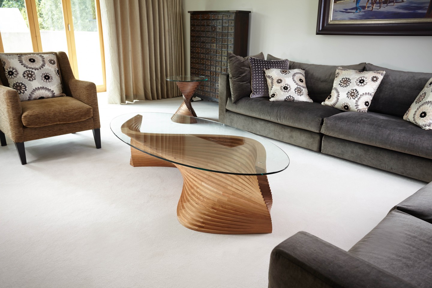 Finally the day came for me to take Sidewinder II (and the two other tables) to their new home. They were delighted with their new centrepiece (and the other two side tables of course) and they thoroughly enjoyed the process. After having had the three tables on the go at once, the workshop seemed quite bare the next day. I had some studio shots taken in Manchester before delivery as well as some in their living room, so even though my babies had flown the nest, with great photos it wasn’t hard to say goodbye.