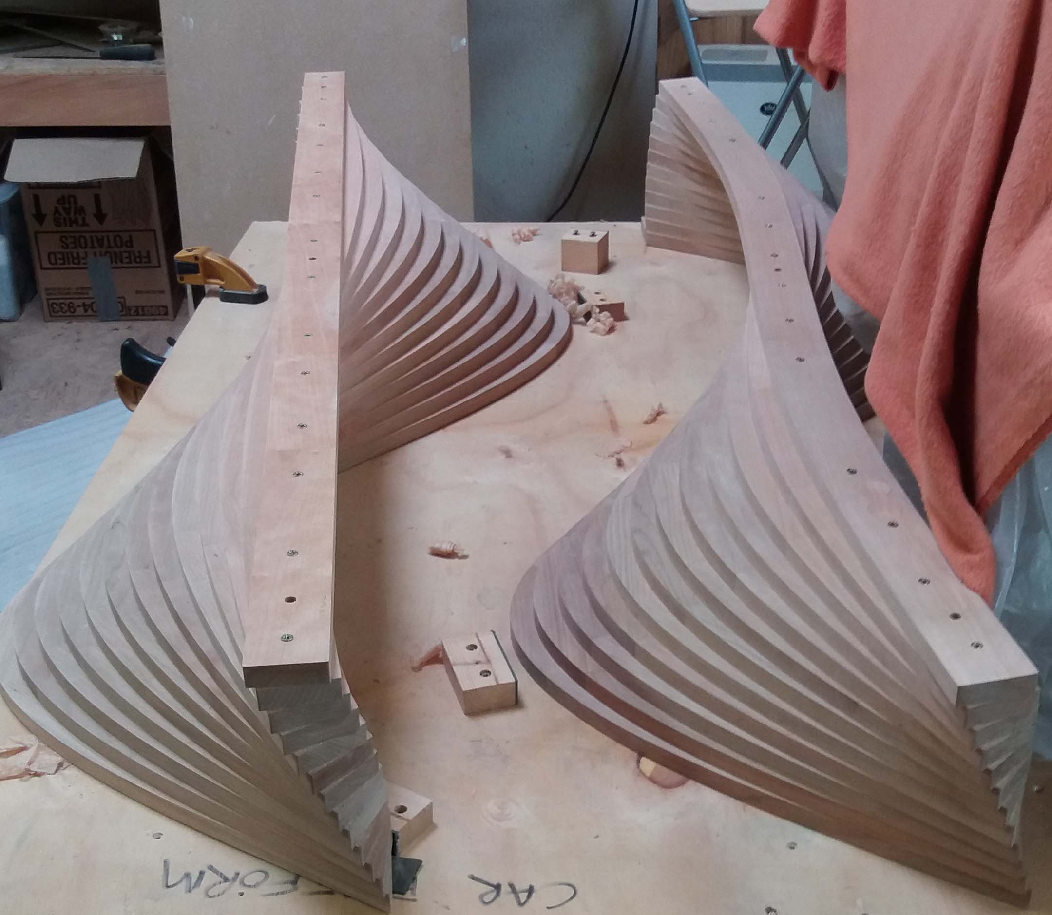 Each section of the coffee table was made up of five pieces that were all jointed and glued to the next. Then this sub-assembly was flattened and sanded before being glued to the next sub-assembly. Bit by bit, the three dimensional form evolved as the layers were built up.